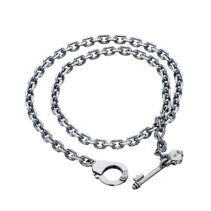 繋ぎ留める力を持つという手錠をあしらったシルバーブレスレット。ゴシック調のアンティークキーをモチーフにしたTバー装置する、ユニークなギミックが身につける人の個性を演出します。